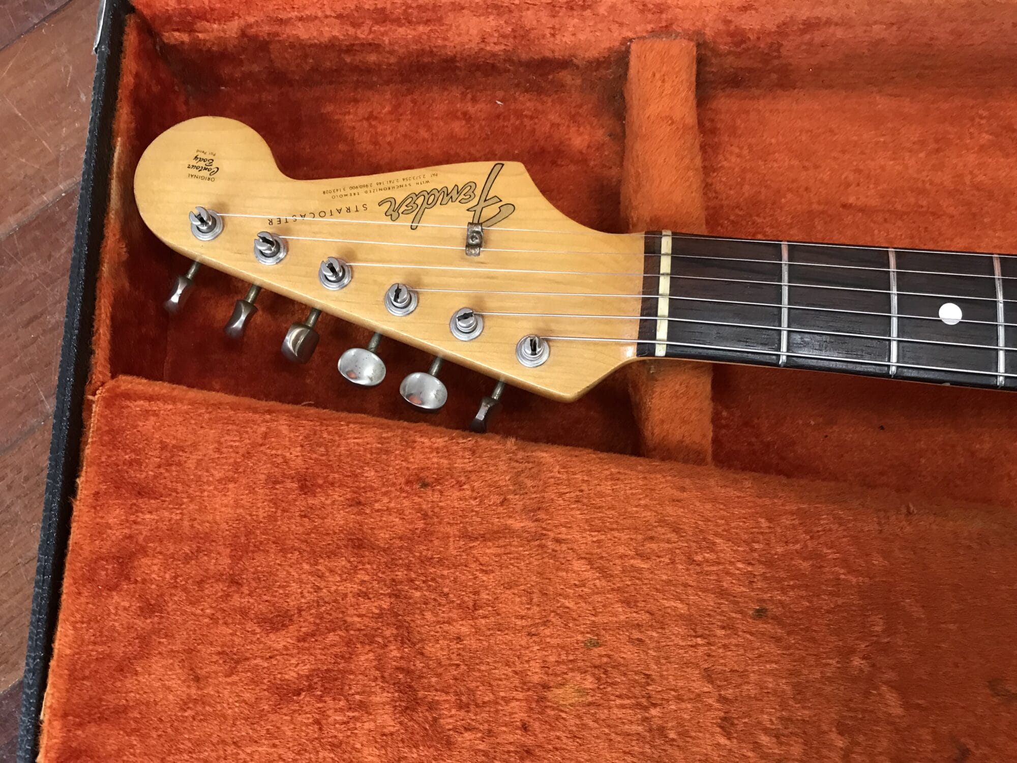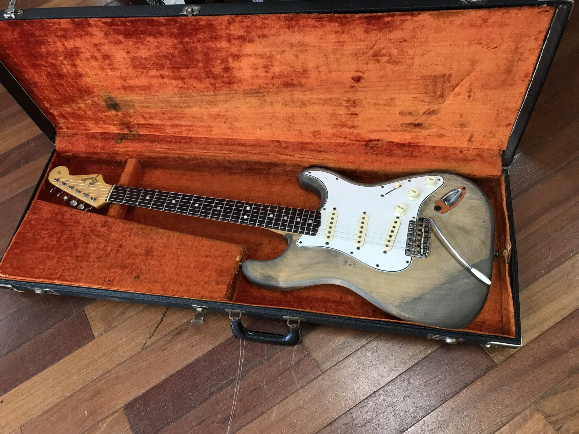July 1965 neck, 1966 pots, original Bridge, 3 way switch, and tuners. No dates on the pickups. 7 lbs 14 oz. Stripped finish.