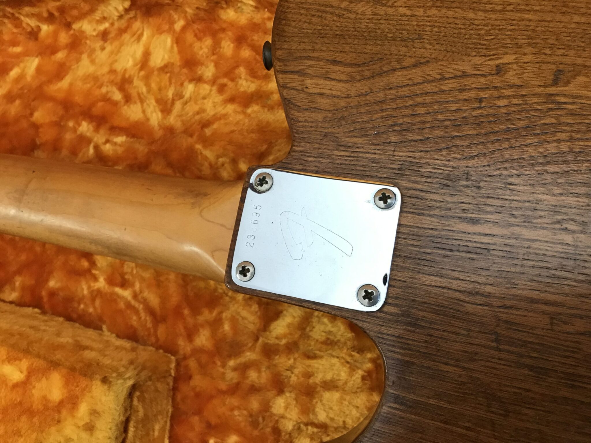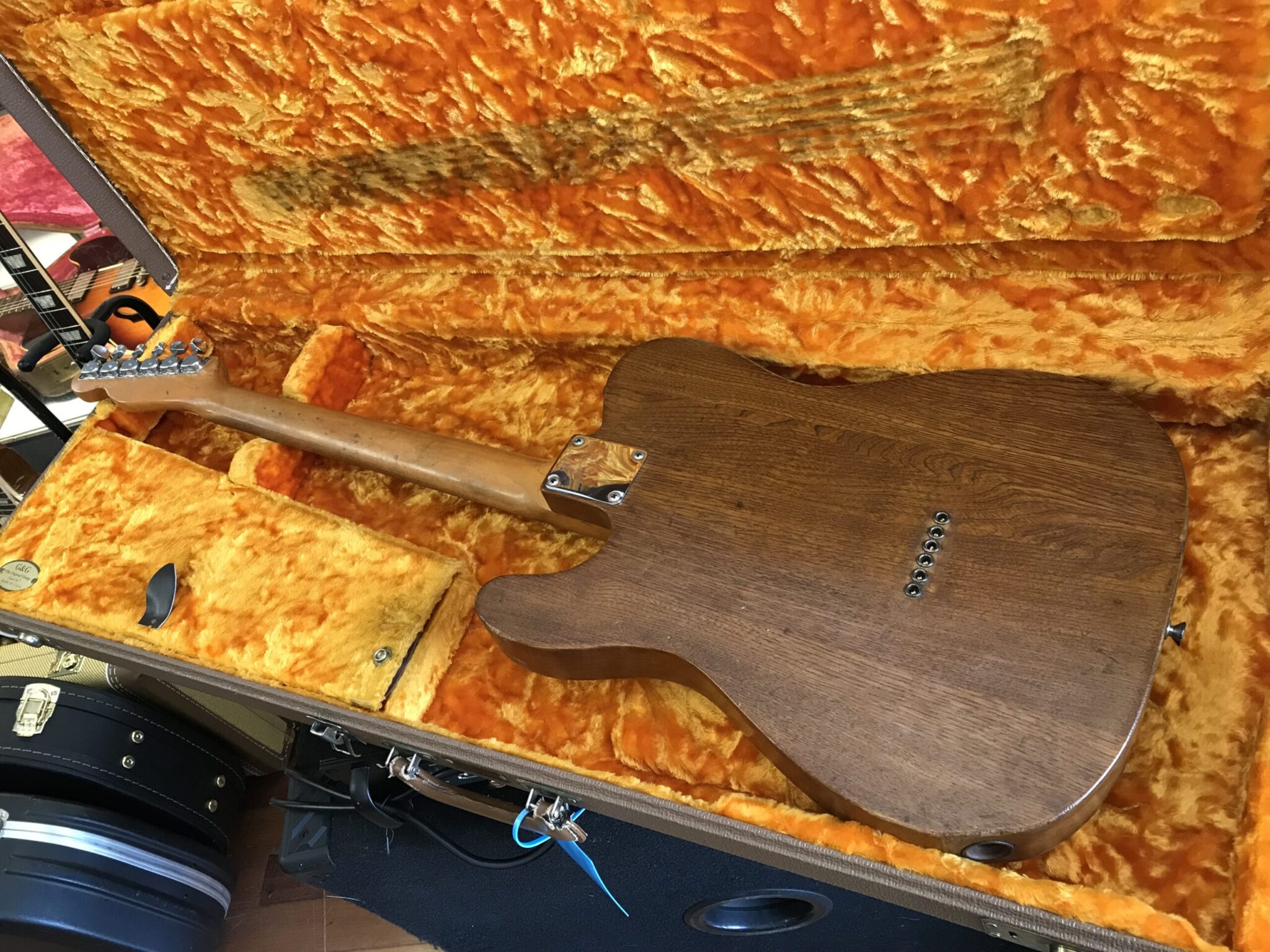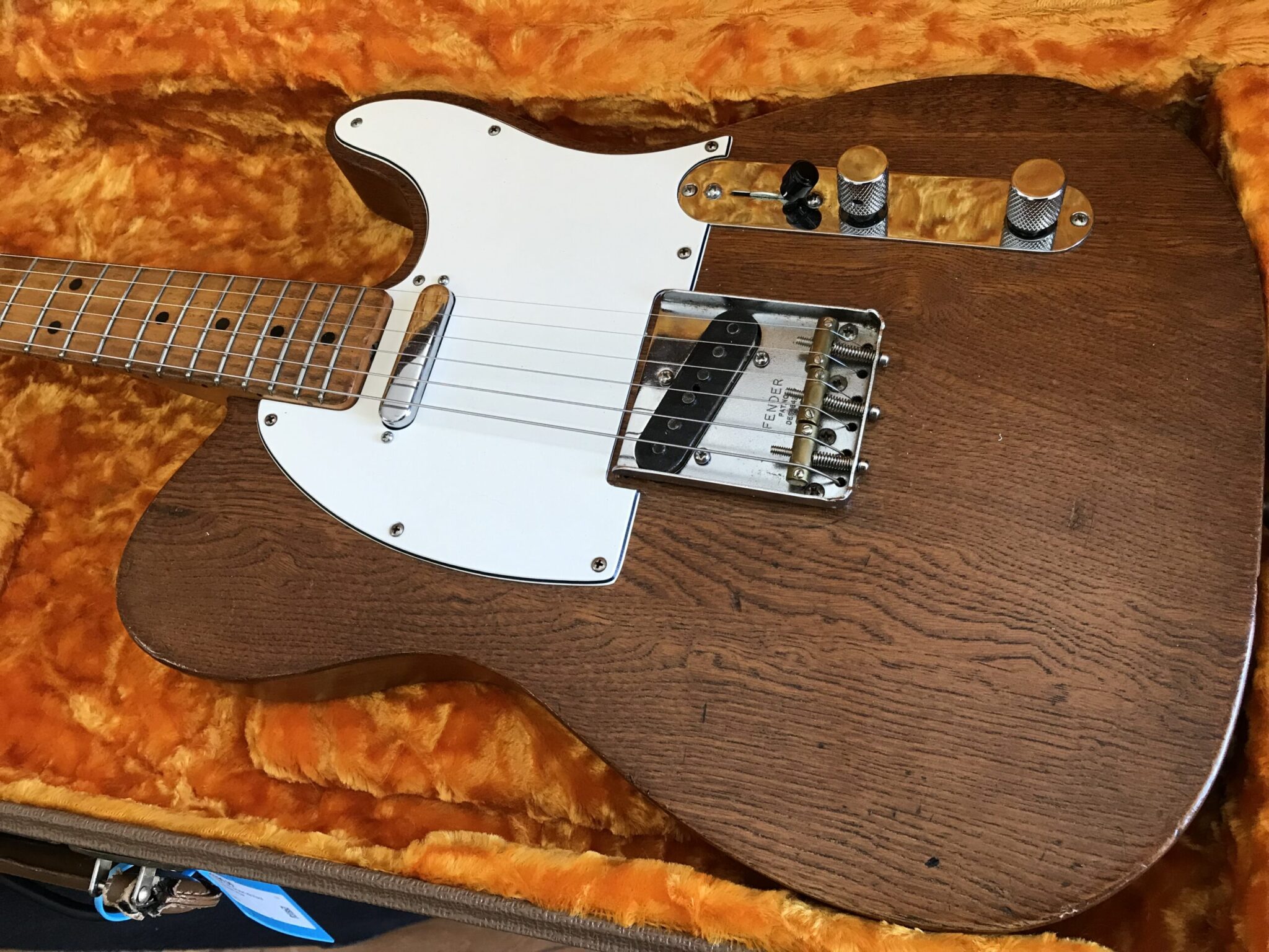 Stripped finish and was routed for a Humbucker. Pots and pickups changed. Neck is June 68 B