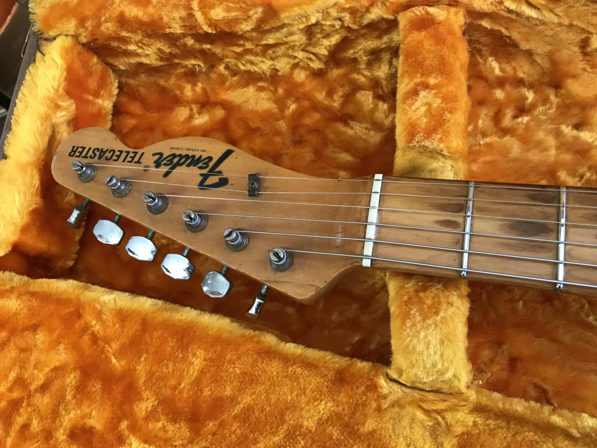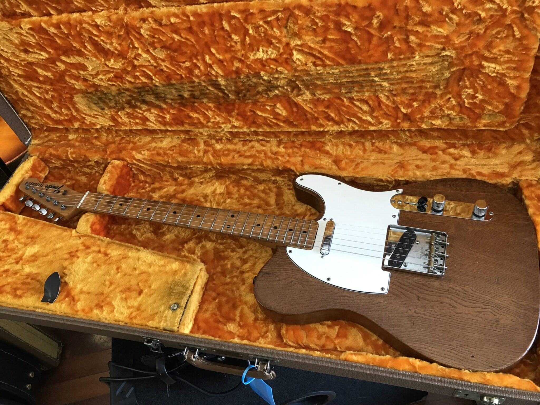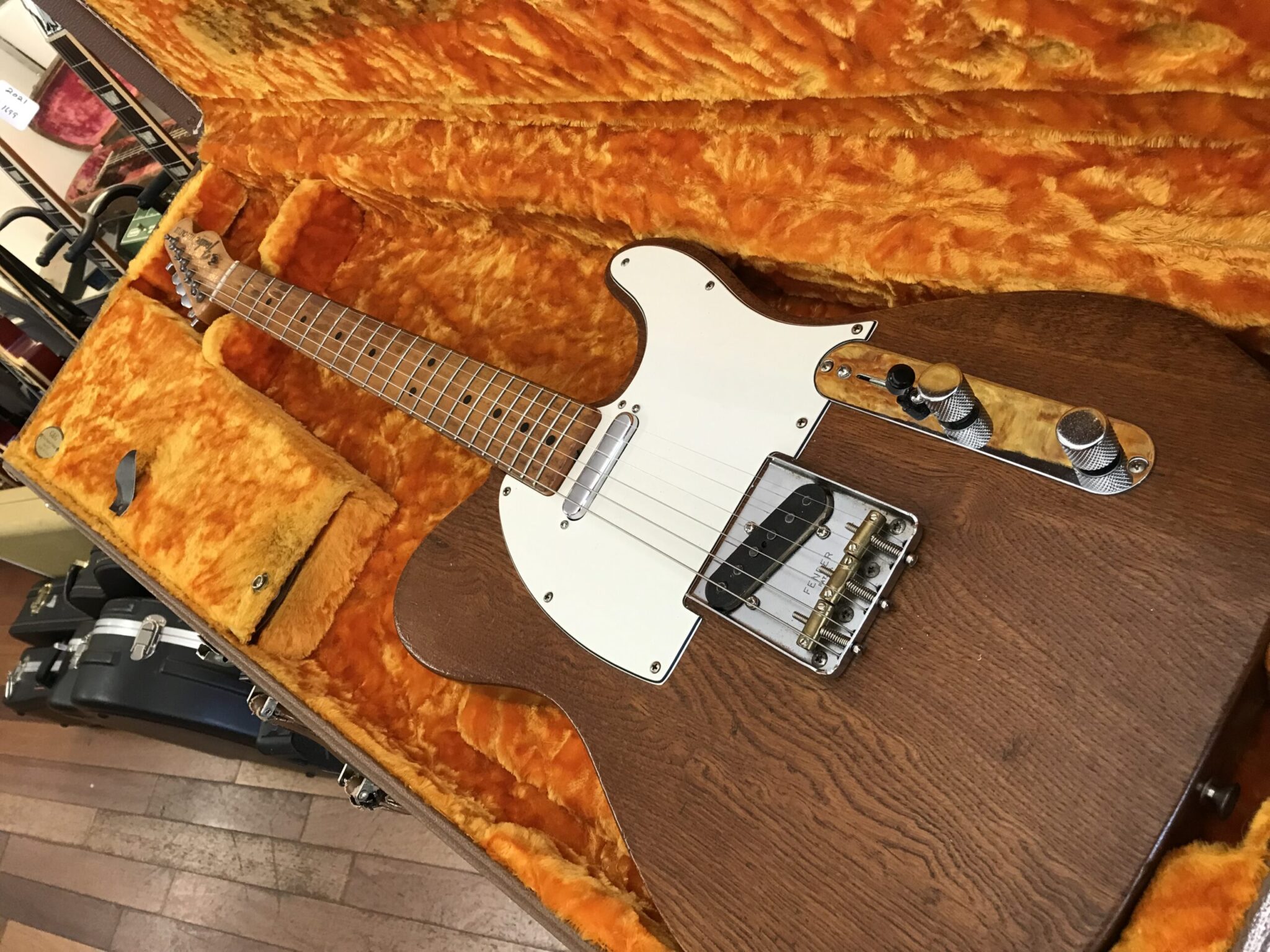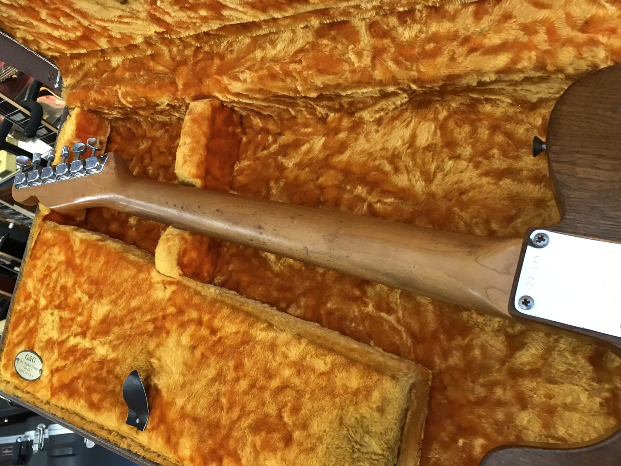Stripped finish and was routed for a Humbucker. Pots and pickups changed. Neck is June 68 B